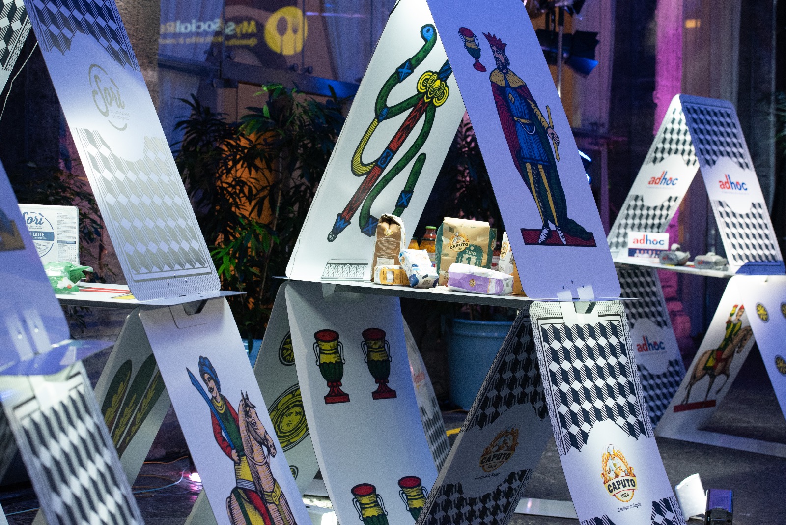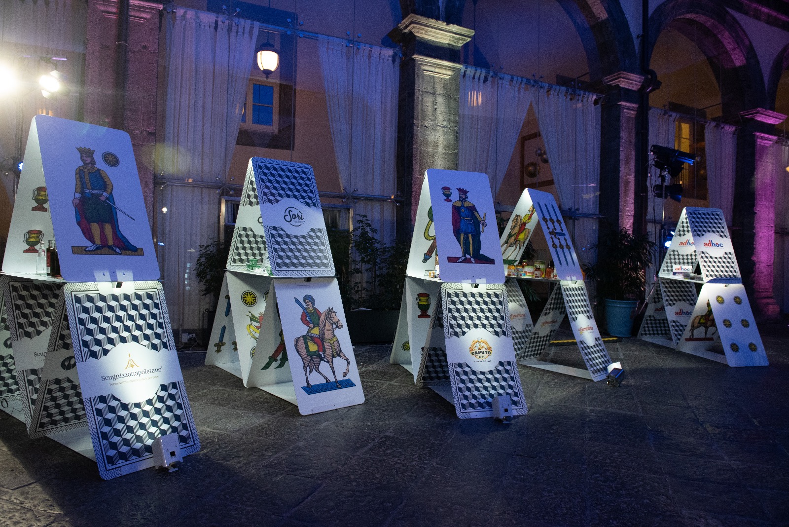 Il progetto in collaborazione con Simona Perchiazzi, ideatrice del concept, prevedeva la creazione di espositori per la promozione di prodotti locali che fossero modulari, di facile assiemaggio e leggeri da trasportare. Si è pensato di sfruttare la suggestiva iconografia delle carte da gioco “napoletane” in sintonia con i prodotti campani esposti.
