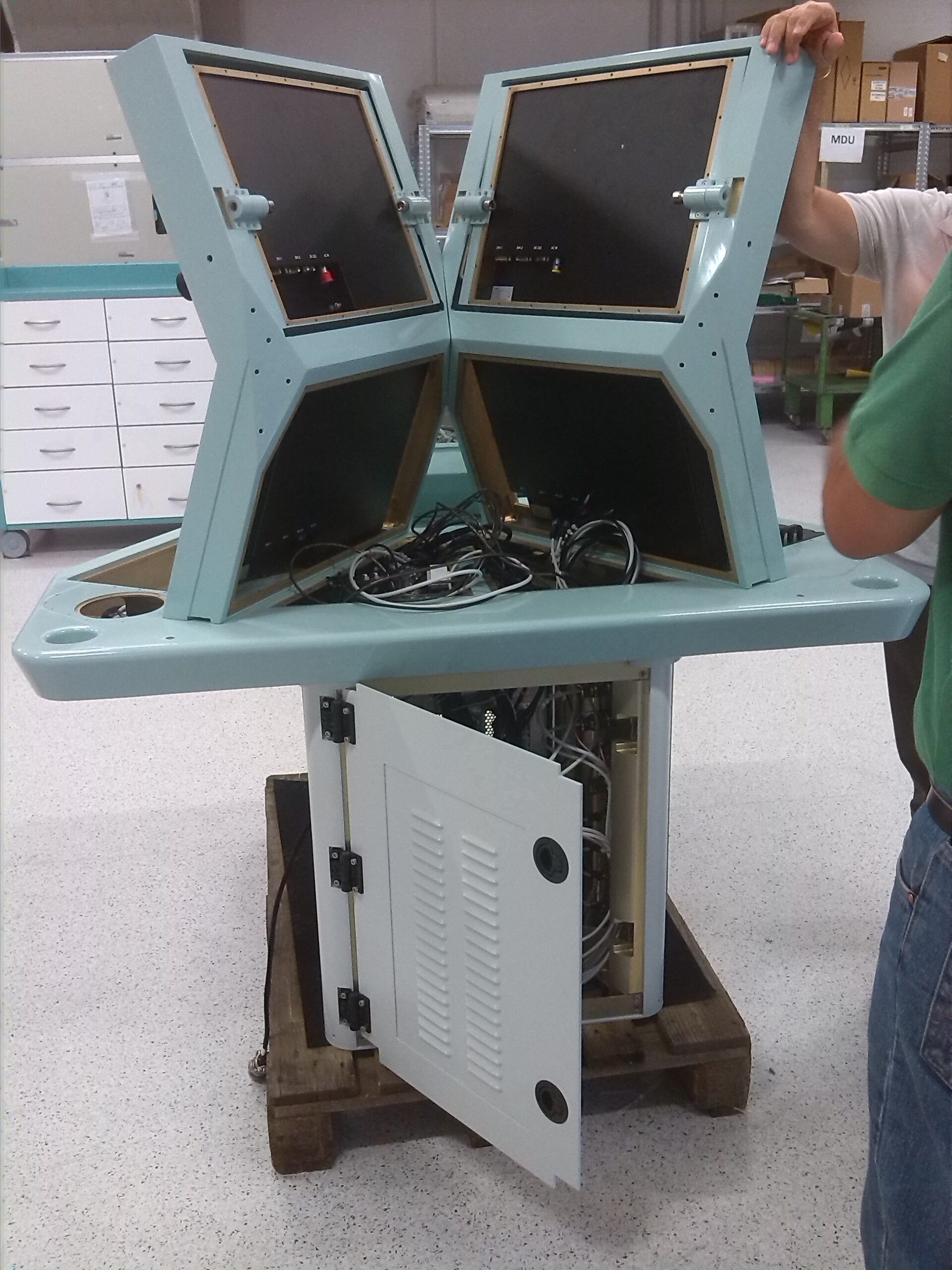Il desk ospita tre postazioni, sul davanti lo schermo touch della postazione principale ed un elemento rotante con un minidisplay che riporta alcune informazioni riservate al capo operatore, sui due lati le postazioni con i desk dei due operatori secondari